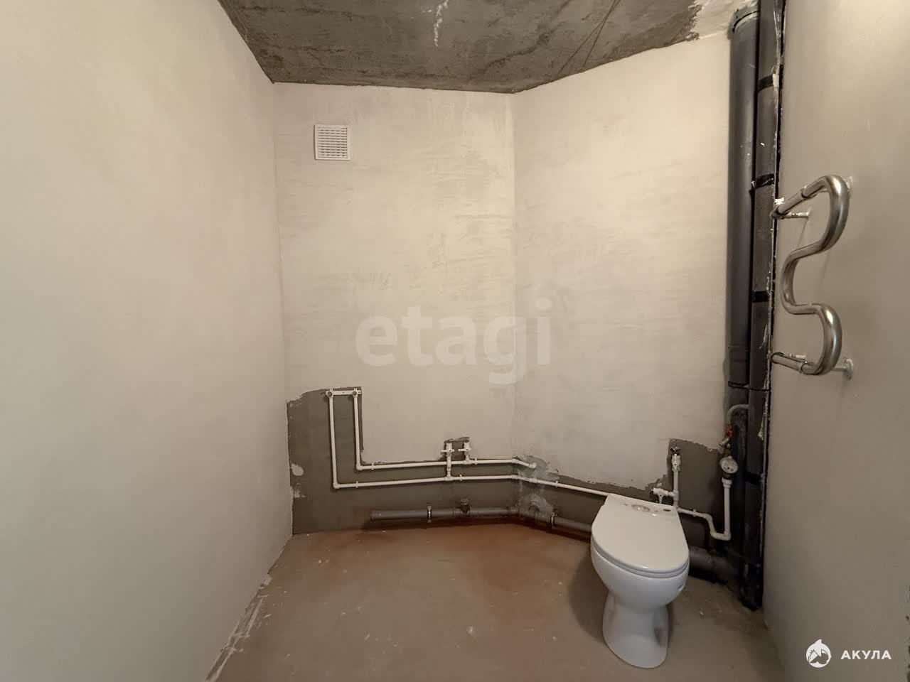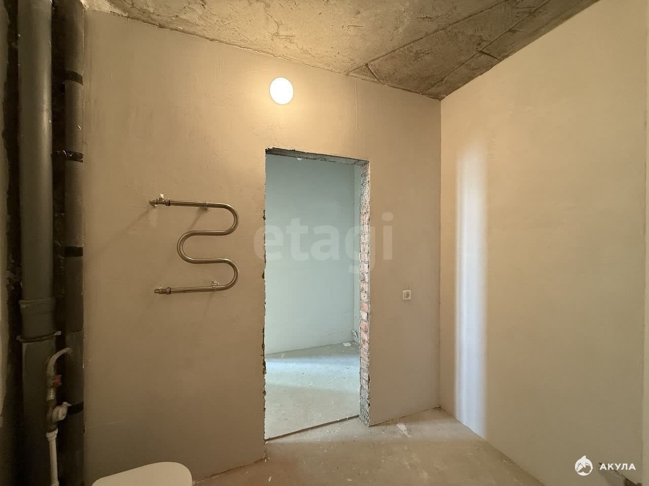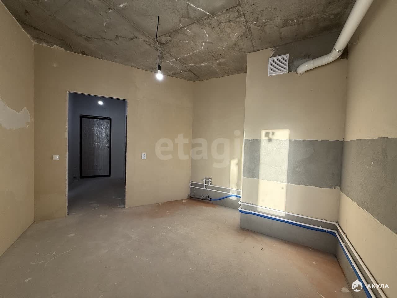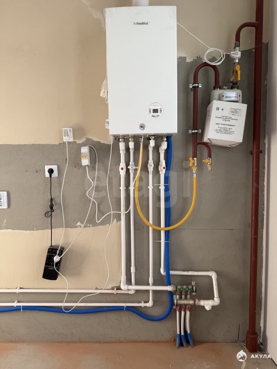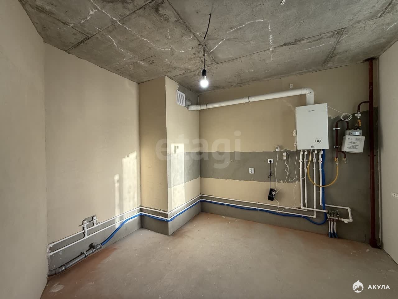 В квартире сделана предчистовая отделка, стены оштукатурены, разведена электрика, стяжка пола, установлен котёл и радиаторы, железная дверь.