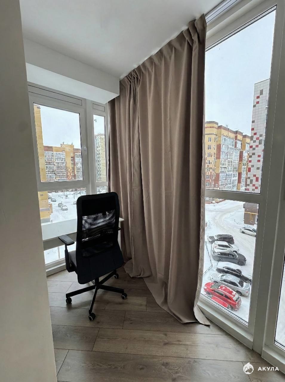 * утеплённый балкон с новым остеклением, оборудованный под рабочий кабинет.