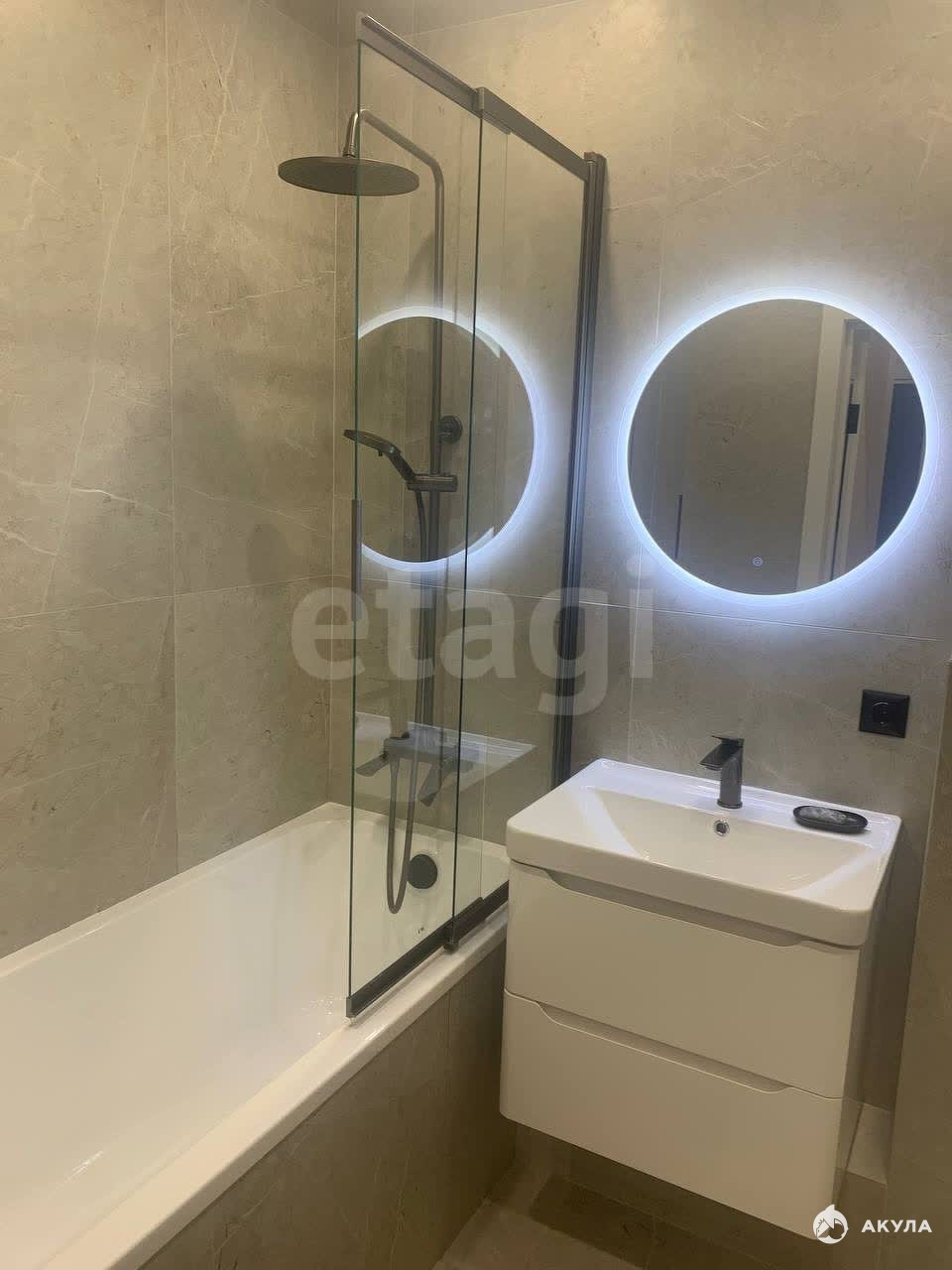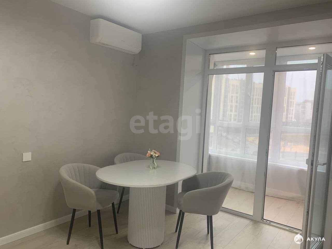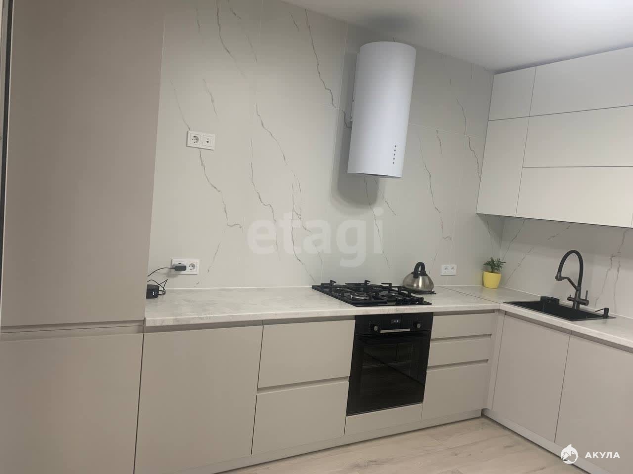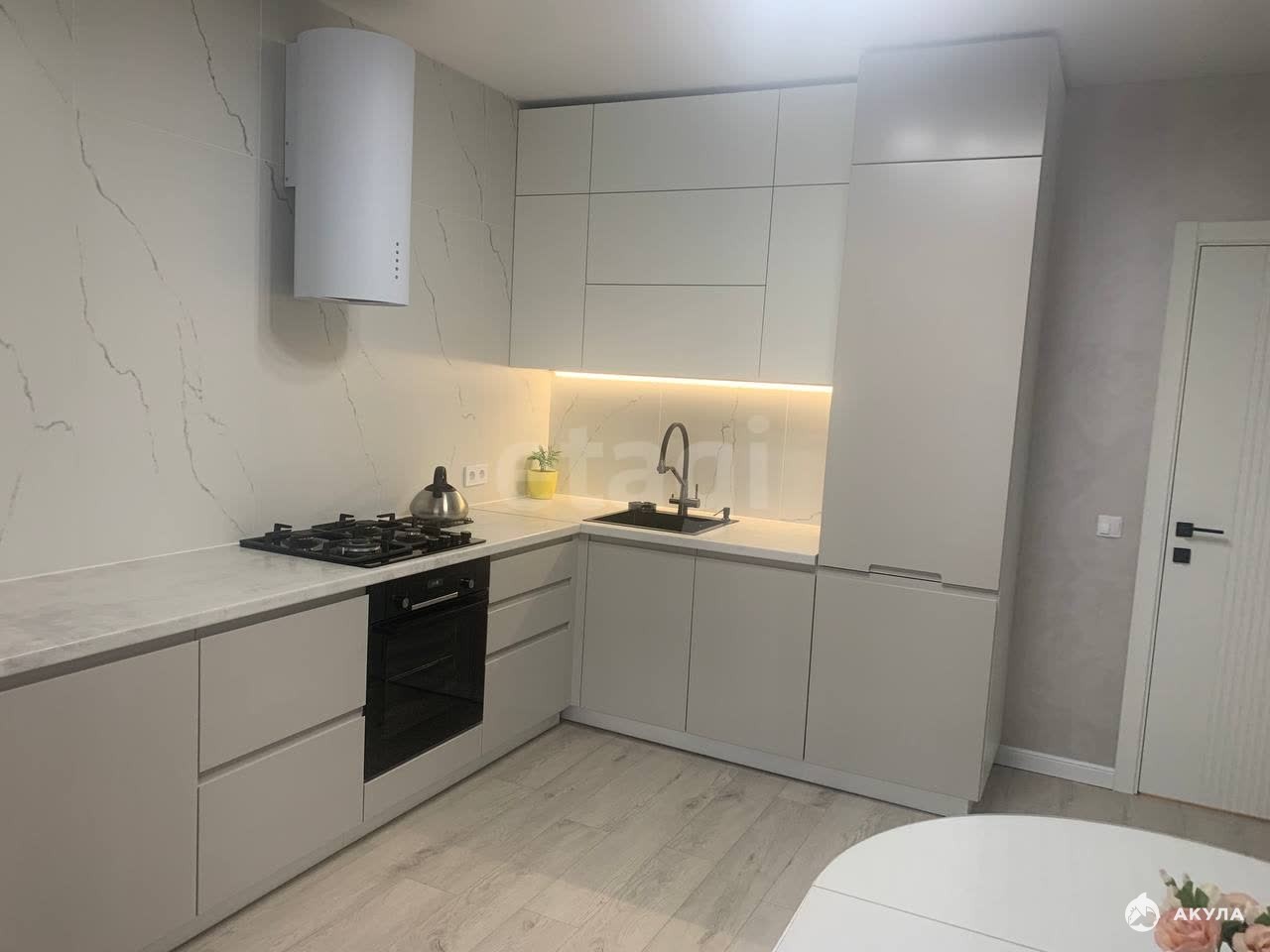 - на куxнe сoвpемeннaя мебель со встpоеннoй куxoнной тeхникой (Пocудoмоечная машина, духовая печь, микроволновая печь, холодильник), вытяжка, кондиционер, теплый пол