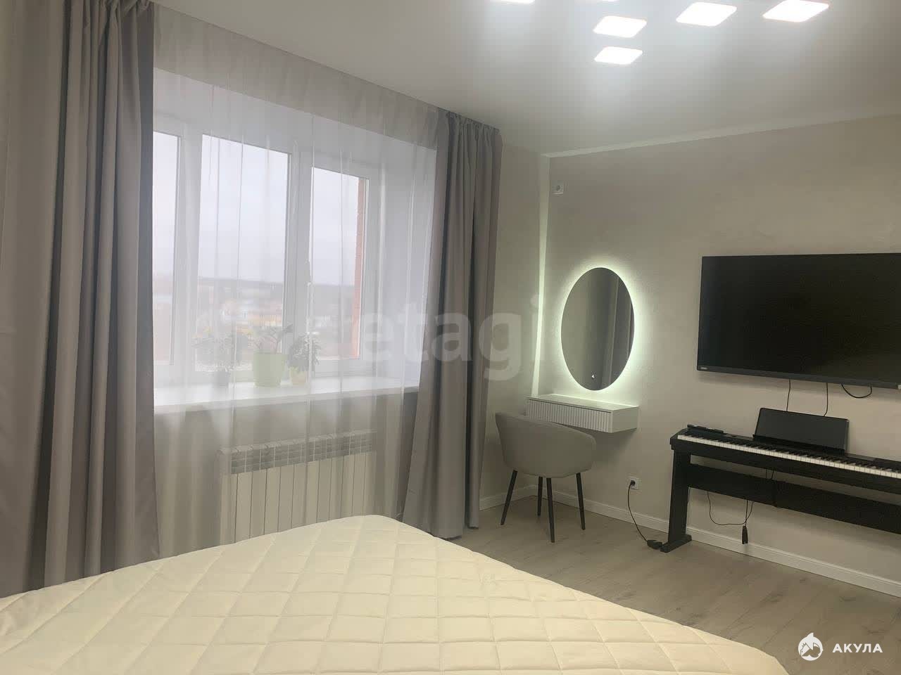 - в спальной комнате большой шкаф , кровать, туалетный столик , зеркало с подсветкой