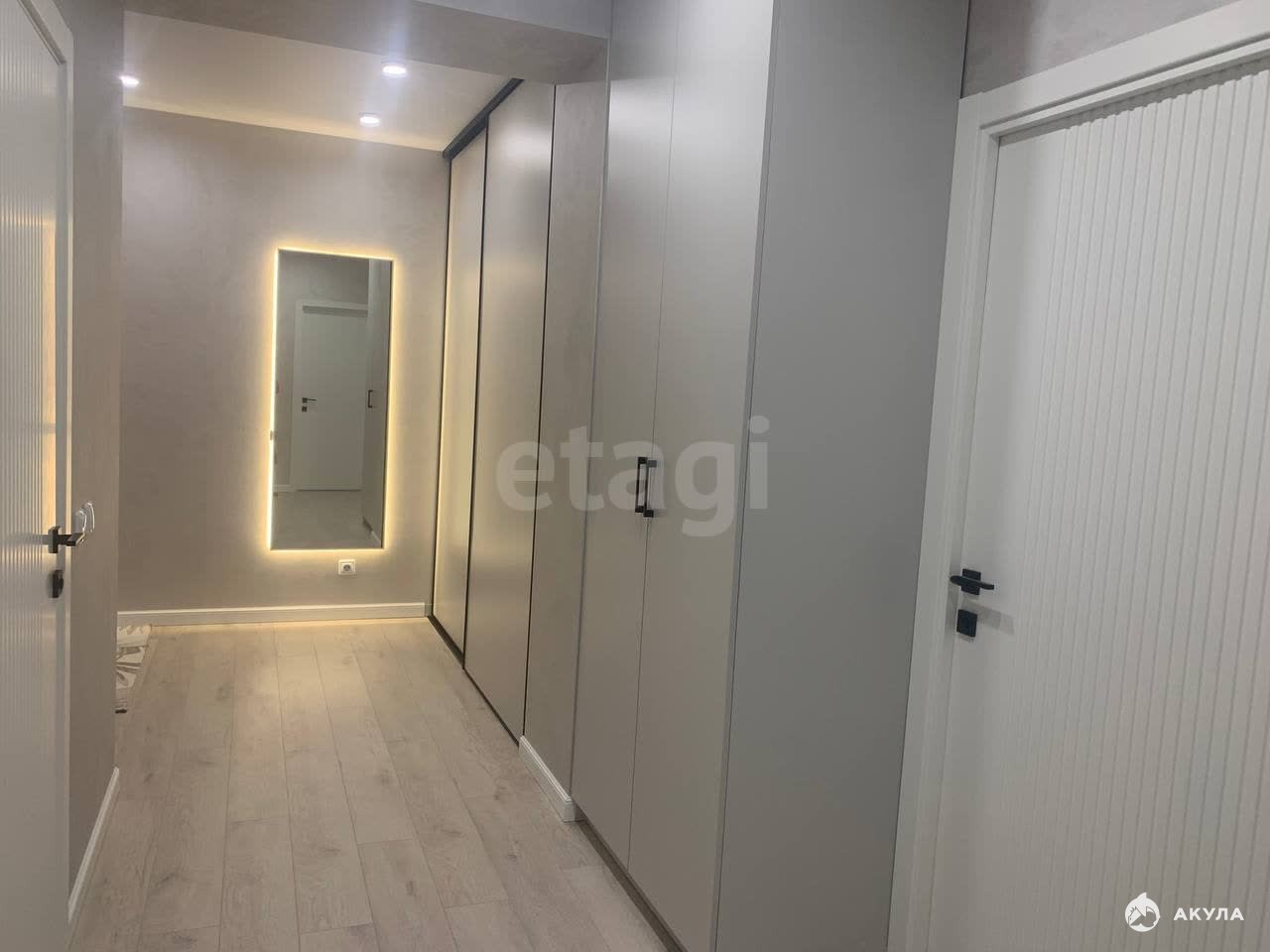 - прихожая с декоративной штукатуркой, встроенным шкафом-купе, зеркалом с подсветкой