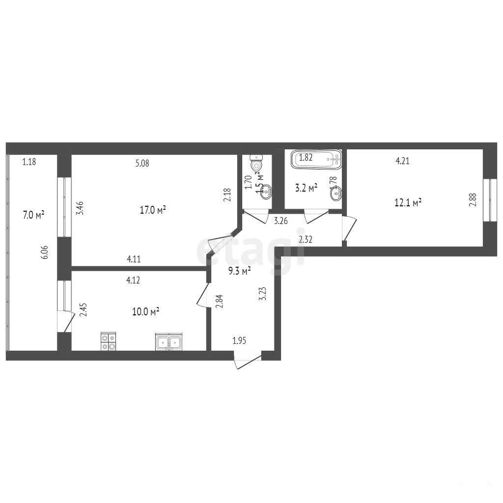 Планировка на две стороны. Большая кухня с кухонным гарнитуром и техникой и выходом на остекленную и утепленную лоджию. Санузел раздельный, установлена качественная сантехника.