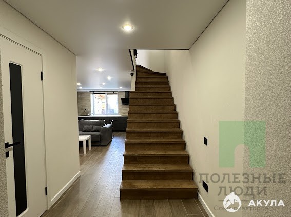 Первый этаж: большая кухня-гостиная, ванная комната с окном, кладовая. Лестница на второй этаж и выход на собственный земельный участок. Второй этаж: 2 комнаты, одна из них мастер-спальня со своим санузлом, гардеробная.